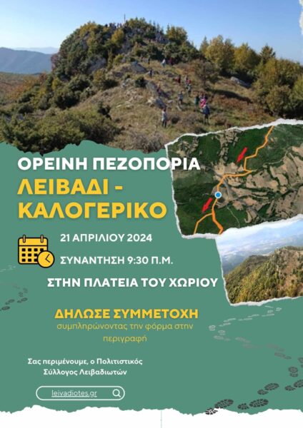 Την Κυριακή 21 Απριλίου στις 9:30 π.μ., συναντιόμαστε στην πλατεία του χωριού για μια όμορφη διαδρομή στη φύση. Ελάτε να χαρείτε στον καθαρό αέρα της φύσης και να διασχίσετε τα υπέροχα μονοπάτια μέσα σε καταπράσινο τοπίο. Κάντε δήλωση συμμετοχής τώρα για να εξασφαλίσετε τη θέση σας.